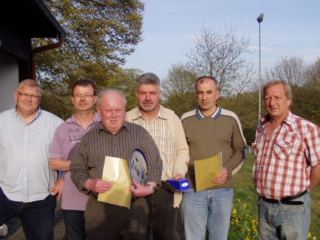 Seit 55 (!) Jahren hält Gustav Berns (TSV Bicken, 3.v.l.) den Referees die Treue, der vor einem halben Jahrzehnt bereits zum Ehrenmitglied ernannt worden war – und am Freitagabend von Kreis-Schiri-Obmann Rainer Wendland (li.) und Lehrwart Roland Horschitz (re.) einen Keramikteller und eine Urkunde entgegennehmen konnte. Für 35-jährige Mitgliedschaft geehrt wurden Thomas Bieber (BSC Sinn, 2.v.l.) und Harald Klabunde (TSV Eibach, 4.v.l.). Beide erhielten neben der Urkunde ein Glasgeschenk mit Gravur. Selim Demirdöven (SSC Burg, 2.v.r.) gehört der Schiedsrichter-Vereinigung Dillenburg seit 15 Jahren an; er wurde mit der silbernen Ehrennadel der Dill-Schiris ausgezeichnet. Sämtliche Ehrungen hatten bereits im Rahmen des Winterfestes 2011 erfolgen sollen und wurden jetzt „nachgeholt“.